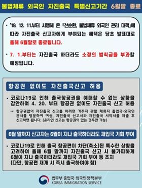 দক্ষিণ কোরিয়াতে অবৈধভাবে বসবাসরত প্রবাসীদের স্বেচ্ছায় স্বদেশে প্রস্হানের বিশেষ সুবিধা চলতি জুন মাসেই শেষ হচ্ছে। কোরিয়ার সরকার অবৈধভাবে বসবাসরত প্রবাসীদের জন্য ২০১৯ সালের ডিসেম্বরের ১১ তারিখ থেকে ২০২০ সালের জুন পর্যন্ত এই সময়ে যারা স্বেচ্ছায় স্বদেশে ফেরত যাবে তাদের জন্য একটি বিশেষ সুযোগ প্রদান করেছিল। যারা এই সময়ে দেশে ফিরে যাবে তাদের কোন জরিমানা গুনতে হবে না সেই সাথে ইমিগ্রেশন থেকে একটি রিপোর্ট নিলে পুনরায় কোরিয়াতে প্রবেশে নিষেধাজ্ঞা উঠিয়ে নেয়া হবে। তবে এখন থেকে জুলাই মাসের ১ তারিখ থেকেও নিজ দেশে ফিরে গেলে জরিমানা গুনতে হবে।