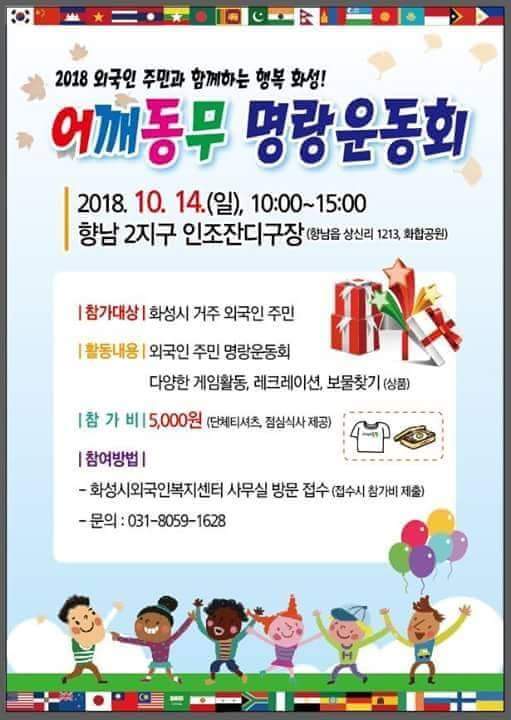 এন্ট্রি ফি ৫০০০ ওয়ান ফ্রী খাবার ফ্রী টি শার্ট স্থান : 화성시 외국인 복지 센터 ১৪/১০/২০১৮ যোগাযোগ নাম্বার :01099023850(কবির হোসেন) থাকবে আকর্ষণীয় পুরস্কার